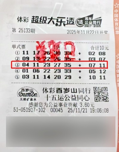 11月22日,超级大乐透第25133期开奖。前区开出号码04、11、23、27、35;后区开出号码07、11。当期本市开出1注基础一等奖,出自一张票面金额为10元的5注直选单式票,单票奖金902万余元。该张大乐透彩票出自位于浦东新区新金桥路738号5F啦啦宝都的市属51917网点。