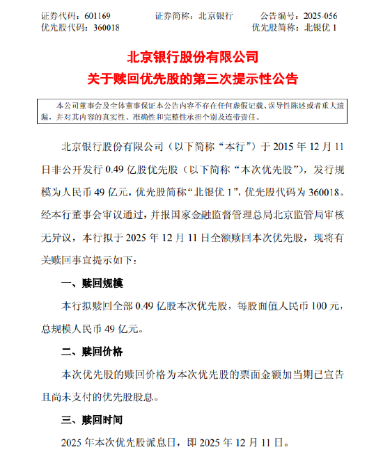 11月27日金融一线消息,11月26日发布公告,本行拟于2025年12月11日全额赎回2015年12月11日非公开发行的4900万股优先股,发行规模为49亿元。