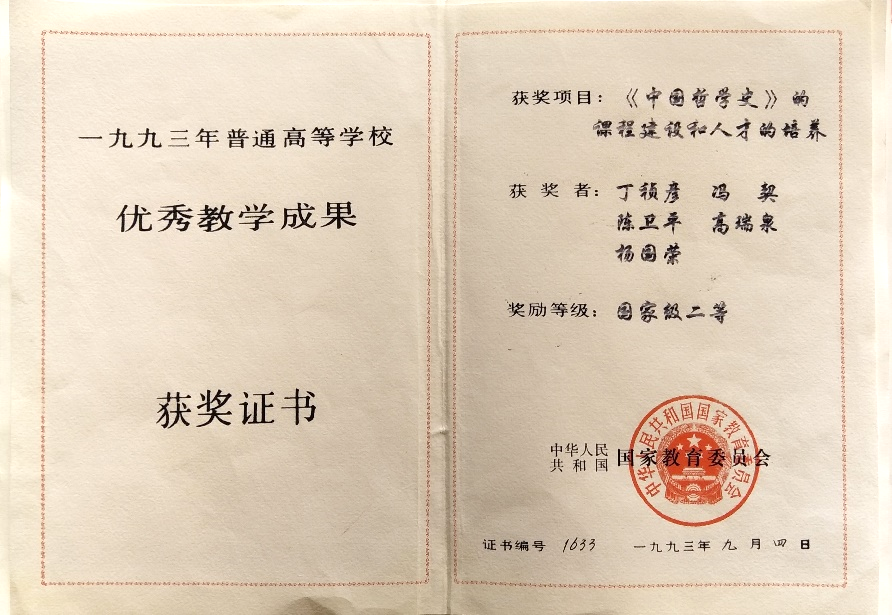 1993年“《中国哲学史》的课程建设和人才的培养”国家级教学成果二等奖获奖证书